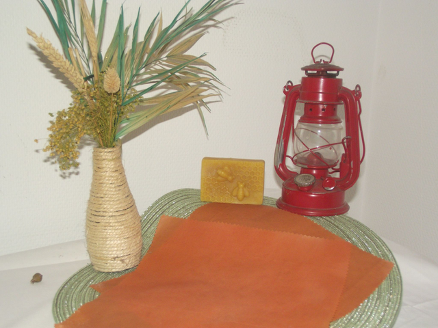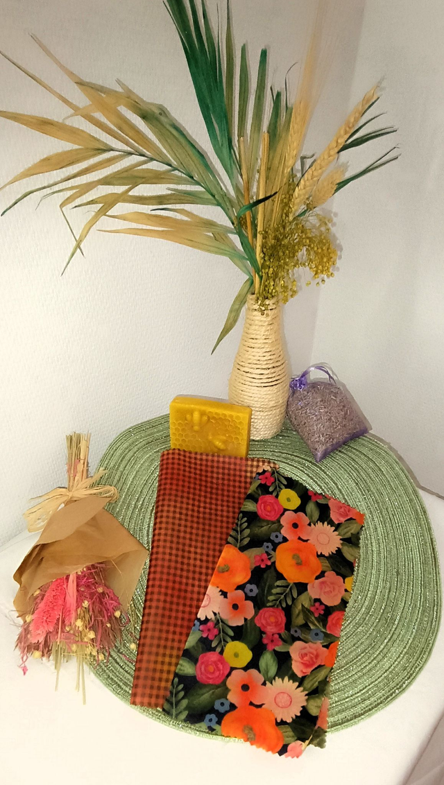 Lot de 2 bee wraps réutilisables, fabriqués à partir de coton récupéré issu de draps pour bébé. Imprégnés de cire d'abeille bio, locale et française, provenant du Rucher du Montcalm (Auzat, Ariège). Une alternative écologique et durable pour emballer vos aliments en toute sécurité.