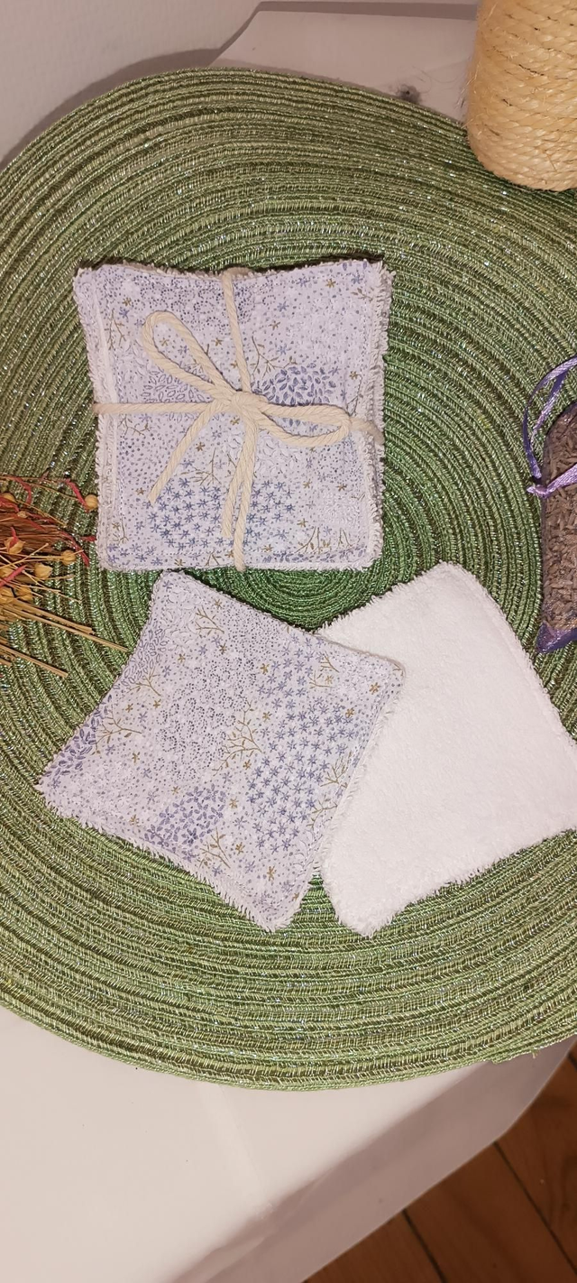 Lot de 10 lingettes démaquillantes lavables, en tissu doux et recyclé, doublées d’éponge. Réutilisables, lavables à 30°C, fabriquées à la main.